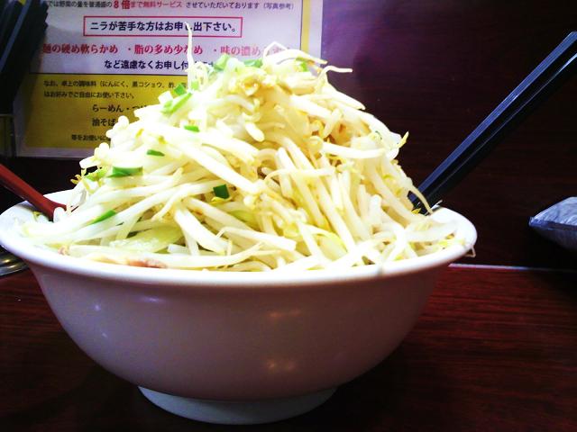 話によると、開店から1年で、大盛り(300g)+もやし8倍=約3kgを食べきった人は2、3人だと言う。「初回だし、足りなかったら後で増やしてあげるから」と言うので、お言葉に甘えて改めて4倍で頼んでみる。