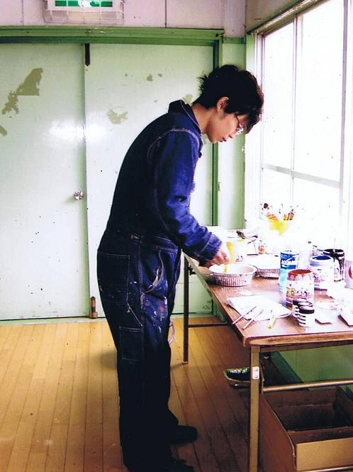 この間、僕は専門学校ではマンガ、大学では舞台美術をと、実に様々な絵を描いてきました。その作品と共に歩んでくれたのが、この「つなぎ」でした。裾にはねたアクリル、袖についた墨汁。まるで、相棒のような存在。衣服が日々を追うごとに「内側」に向いてくる。
