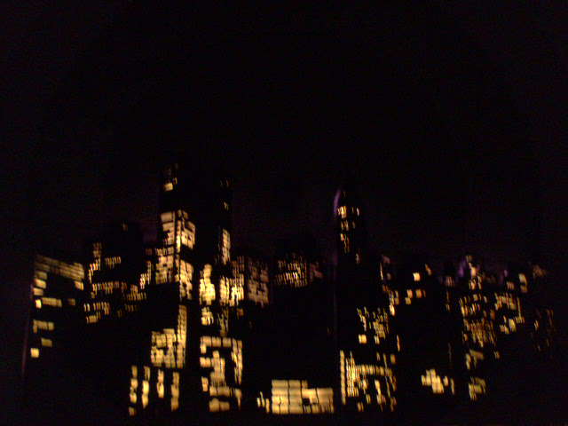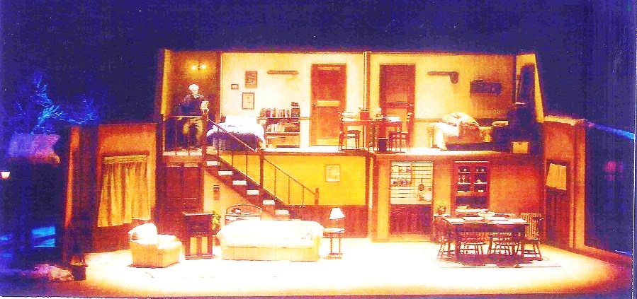 四大学英語劇大会という日本一の英語劇大会を経験した年。僕が担当したのは、天窓から見えるニューヨーク街の夜景。べニアに絵を描いて、窓をくりぬく。奥行きを出すために消失点をいくつ使ったかわかりません。色もこの写真だと分からないのですが、ビル群はかなり明るい色で塗られています。夜空に近い上の暗い部分から、街灯で照らされた下に向かって、明るくグラデーションをかけています。さらに、くりぬいた窓に裏から和紙を貼って、後ろに電球を仕込む。電球の数を操作することでビルの明かりを調節し、台本の中の時間帯を表現しました。