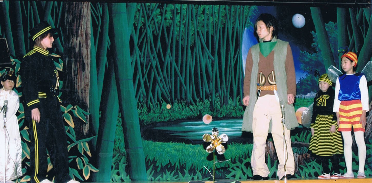 先ほどのグラデーション手法を、こちらのミュージカルの背景画にも応用。この年から横幅が12mに拡大し、しかも1か月で2枚も描くというスケジュールだったので、すごい大変だった記憶があります。でも、職員の方々や、スタッフの温かい声援、子ども達の笑顔がすごいうれしかったなぁ。