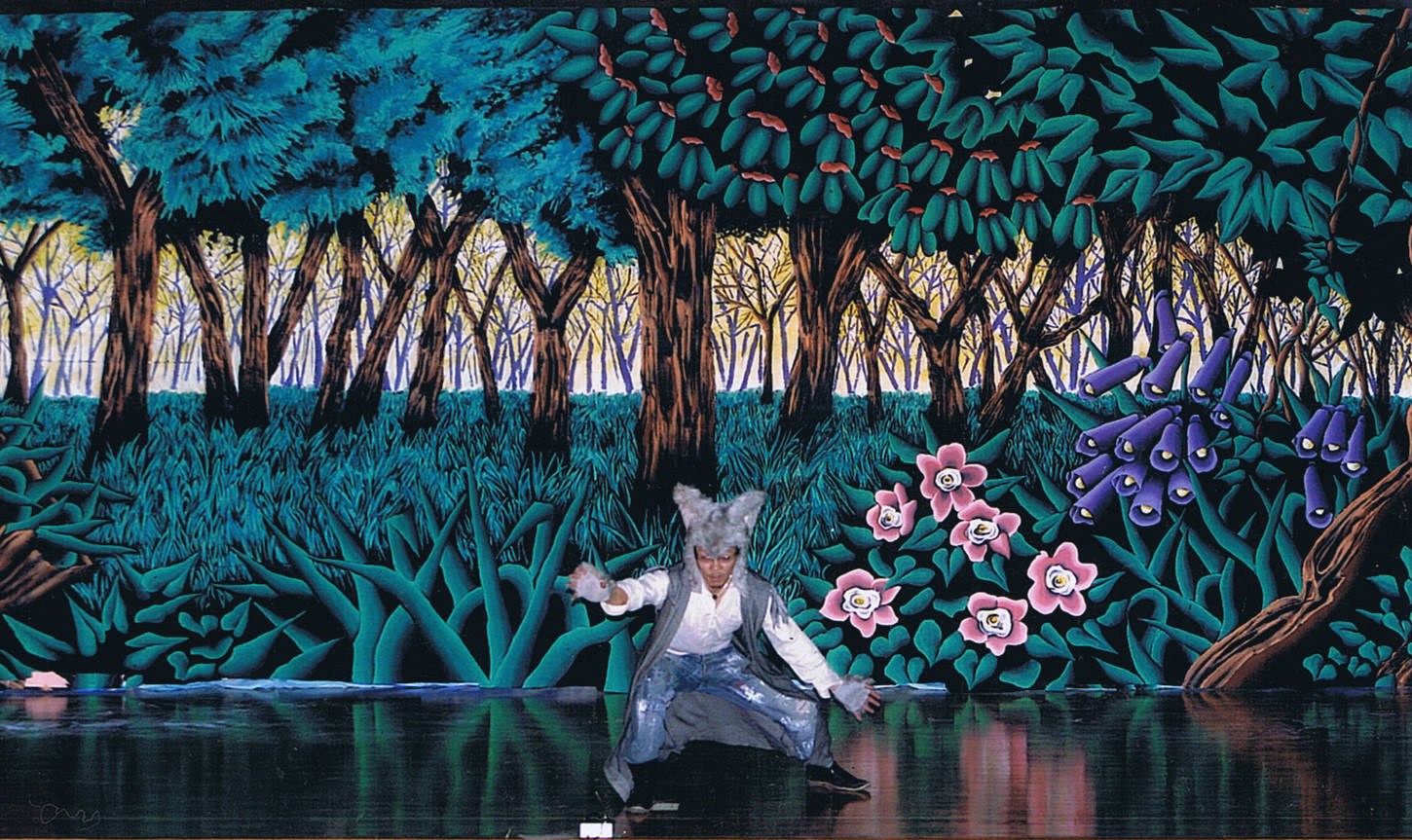 初めて舞台背景を手掛けたもので、幅8m・高さ3mという大きな絵。薄い布にペンキで描きました。舞台の奥行きを出すために二点透視法を採用。思えばこれが、僕が「舞台美術」に興味を持った最初のきっかけだったのもかしれません。