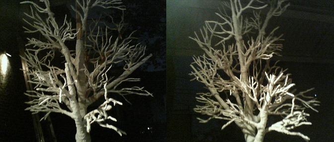 これ、何でできていると思います??大まかな骨格は木材(タル木・小割)、枝部分はピアノ線。それらに新聞紙をらせん状に巻いて凸凹感を出します。最後に白い布をラテックスで貼り合わせて行き、完成!高さ3m以上、男3人でやっと持てるくらい重かった(汗)搬入が大変だったっけ。