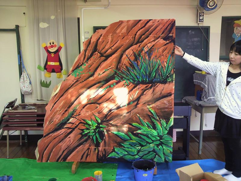画像は、「竜の棲む入江」のシーンで使う大道具です。大きな絵を描くって、やっぱり楽しい!下地の段ボールは、青年スタッフのじょっきーとなぎさが作ってくれたので、僕は色を塗るだけ!本当に助かりました。ありがとう!じょっきー、なぎさ!