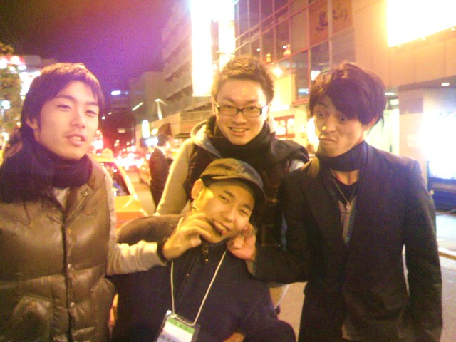 21時すぎには、三輪組のムードメーカー・亮太(写真中央奥)と、イケメン・カズくん(写真右。ホリ深いが沖縄出身ではない)が合流!久しぶりの再会に、駅前でおおはしゃぎ!!ちなみに、変態・浮田チンコはインフルエンザにかかり、今日は欠席でした~。