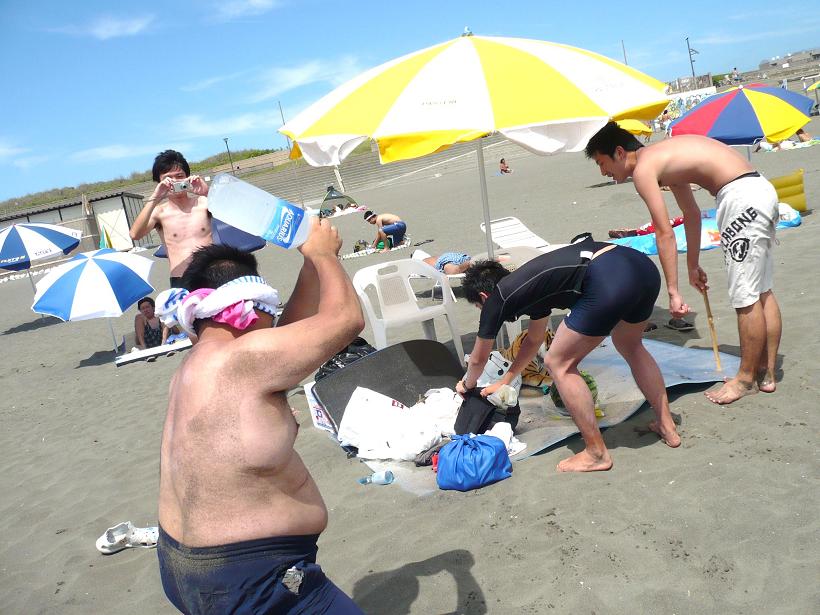 恒例のスイカ割りをやっていると、スタッフの人が寄ってきて「今年初めて見ましたよ~」と興味津津。最近、みんな海でスイカ割りとかやらないみたいですね。楽しいのに・・・。やるんだったら、海に行く前に地元で買っていくのが定石です。一玉1500円くらいですよ。なんか、去年に比べて人が少なかった!!3分の2くらいだったんじゃないかなぁ。