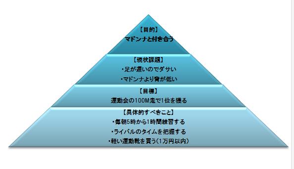 こんなふうに、なります。まぁ、いろいろなマトリクスがあるので、これが唯一のものではありません。ケースによっては、目標が複数個、並列になる場合もあるし、目標によって優先順位が付けられる場合もある。