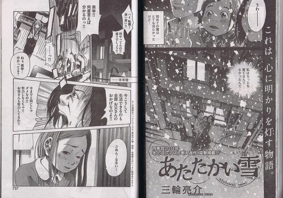 2012年2月25日(土)発売の「月刊アフタヌーン4月号」(講談社)にて、先日受賞した『あたたかい雪』が全篇掲載されました。これが僕の誌面デビューとなります。初めての掲載で、反省点もたくさんありますが、とりあえず今は、素直にメチャクチャうれしく思っています。次回作も載せてもらえるように、描くぞ!