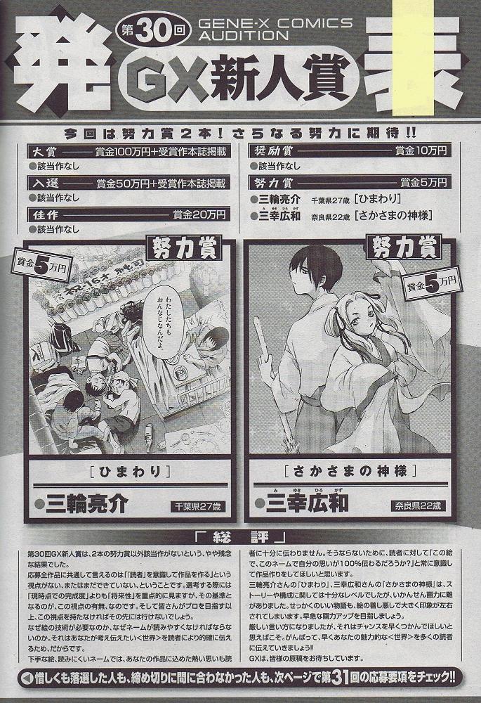 確かに雑誌をめくってみると、かわいいヒロイン役の女の子達がたくさん出て来る。明らかに僕のマンガとは毛並みが違う(+o+)リサーチ不足だった!『ソラニン』作者の浅野いにおさんもGX新人賞出身って聞いてたから、「俺の路線でもいけるだろう!」と思ってた(T_T)!もともと浅野さんは「スピリッツ」に担当の方がいたようで、その担当の方が部署移動で「GX」に来たのがきっかけで連載を始めたのだとか。かなり異例だったみたいだし、連載当初は全然人気がなかったみたいです。
